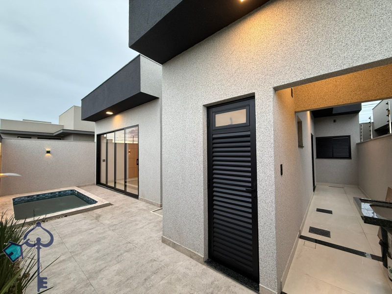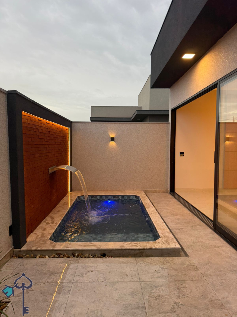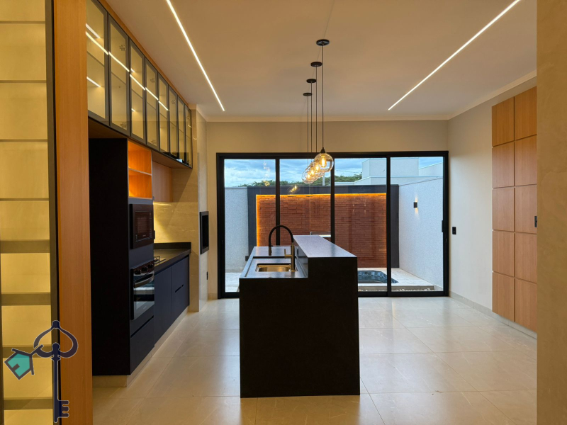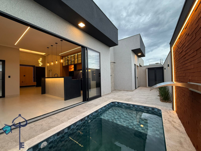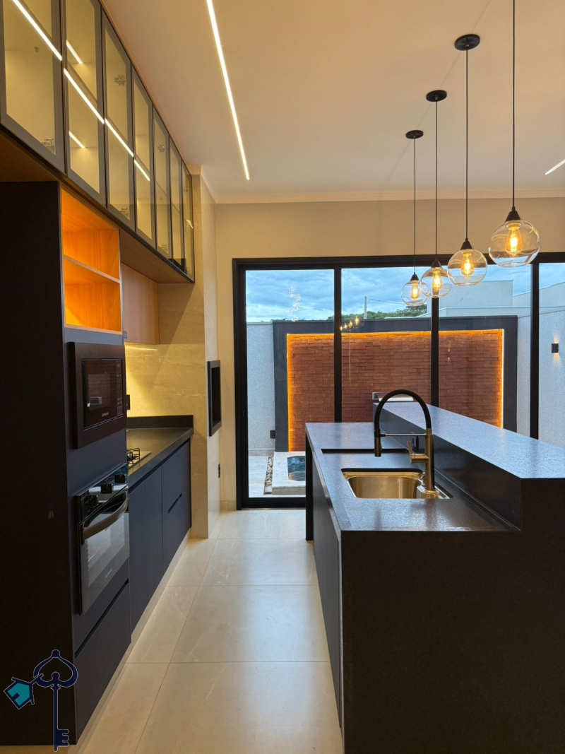 Belíssima casa à venda no Condominio Eville, no bairro Mais Parque, Zona Leste de Rio Preto, com 3 dormitórios (1 suíte com closet); sala de estar; sala de jantar; cozinha gourmet com churrasqueira, cooktop, depurador, forno, microondas e cuba gourmet; banheiro social; lavabo; área de serviço; piscina com prainha, cascata, hidro e LED; e garagem coberta (2 vagas).
